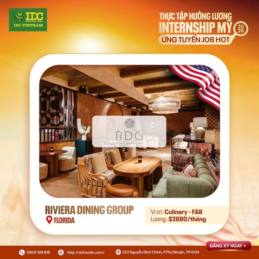 Thực tập hưởng lương tại Mỹ ngành F&B không chỉ là một chương trình thực tập – mà còn là bước đệm vững chắc để phát triển sự nghiệp quốc tế. Với nền tảng kiến thức, kỹ năng và kinh nghiệm thực tế tại Mỹ, bạn sẽ nổi bật hơn trong mắt nhà tuyển dụng dù ở Việt Nam hay bất kỳ đâu trên thế giới. Hãy liên hệ với IDC VIETNAM để được tư vấn chi tiết chương trình thực tập hưởng lương tại Mỹ ngành F&B.